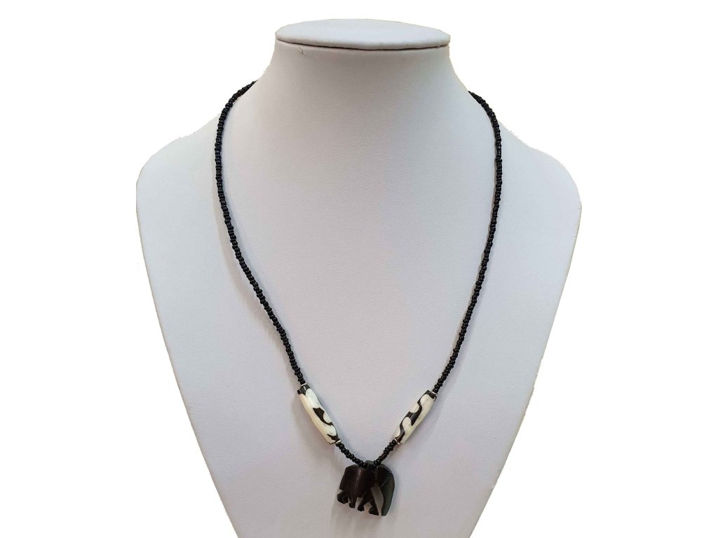 Tento etno náhrdelník spojuje batikovanou kost s motivem afrického zvířete a skleněné korálky pro harmonický celek. Každý kus je ručně vyroben v Keni z upcyklovaných materiálů, od vyčištění kosti, řezání, broušení a barvení až po leštění, díky čemuž se každý korálek stává originálem. Náhrdelník je unikátní, vhodný pro každodenní nošení a pro všechny, kdo hledají stylový a etnický šperk..