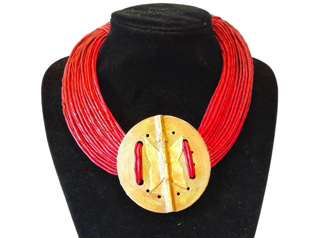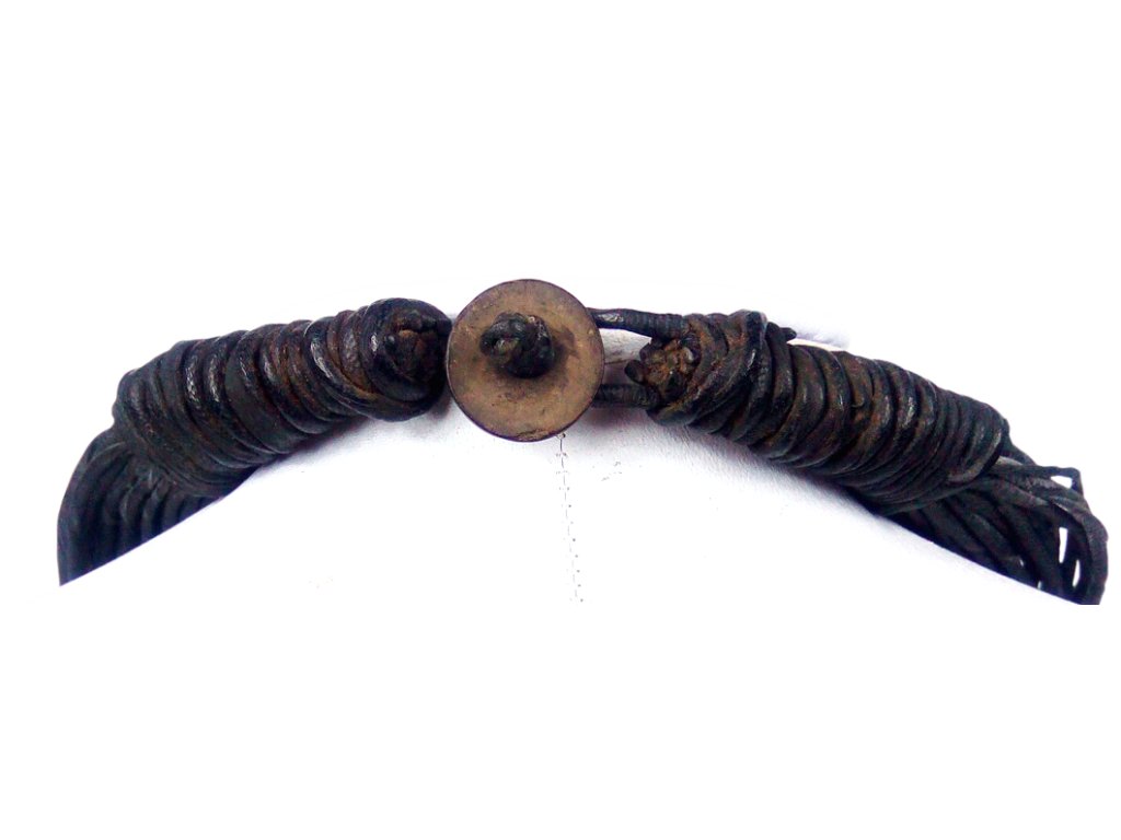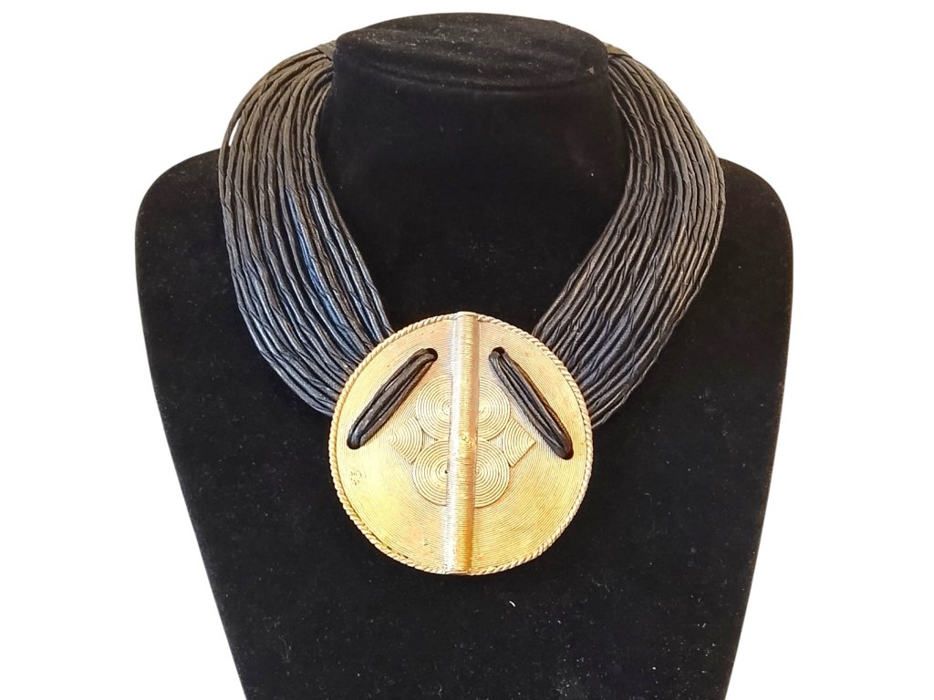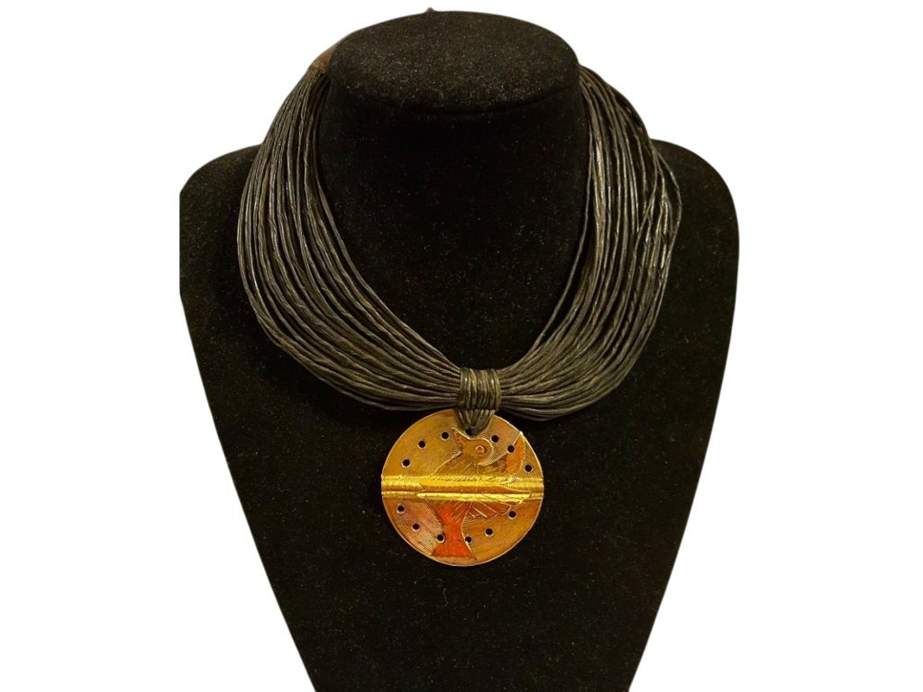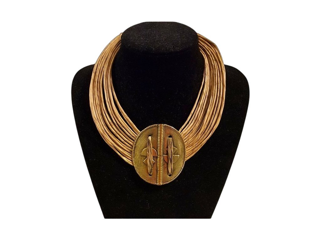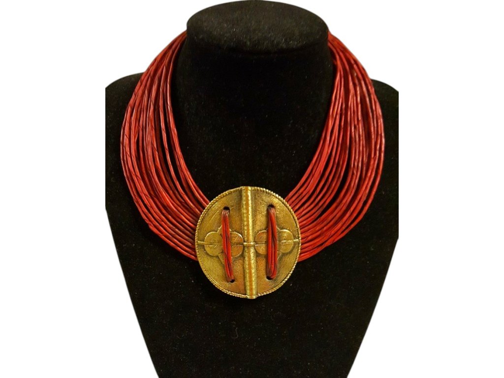 Tradiční náhrdelník tvořený desítkami zkroucených kožených šňůrek, doplněný velkým bronzovým přívěskem, představuje opravdové umělecké dílo z Burkiny Faso. Každý kus je ručně vyráběný, což se odráží v jeho jedinečné struktuře, drobných detailech a autentickém charakteru – žádné dva náhrdelníky nejsou stejné.