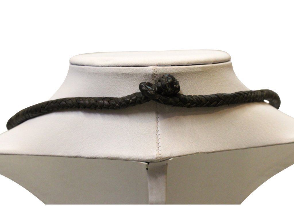 Výrazný, a přesto lehký ručně pletený náhrdelník z Mali propojuje autentické africké řemeslo s elegantním boho stylem. Tepaný bronzový přívěsek, zdobený jemným spirálovým ornamentem, krásně vyniká na masivní kožené šňůře v hadovitém vzoru, která šperku dodává charakter i hloubku.