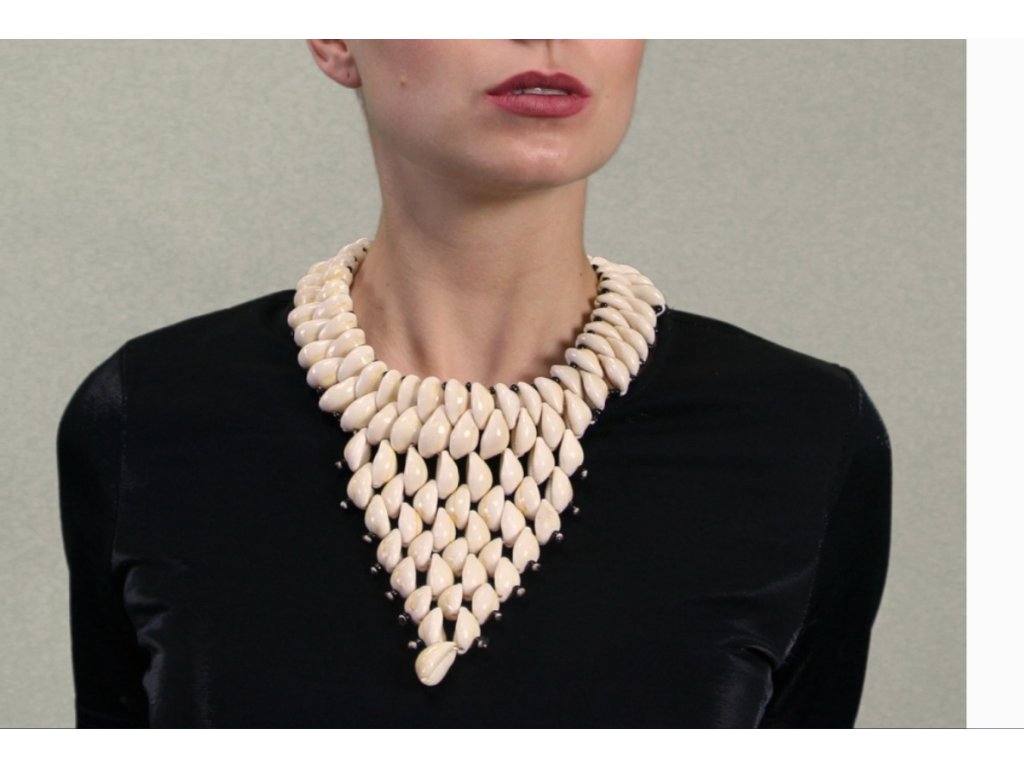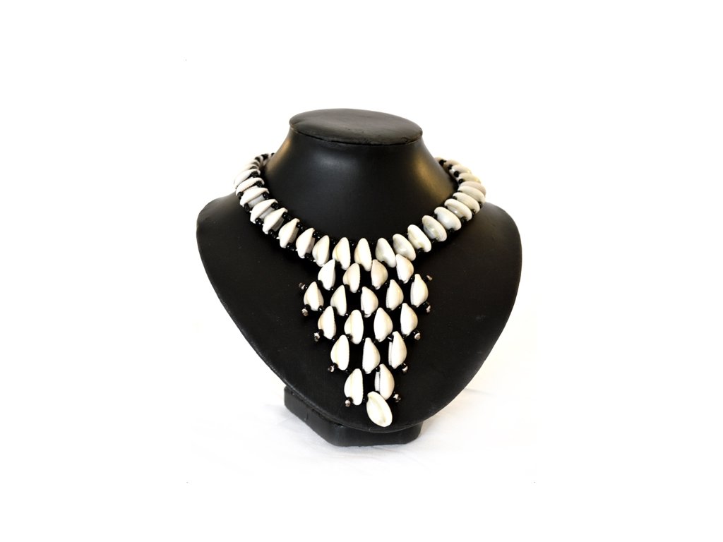 Tento ručně vyráběný náhrdelník z přírodních mušlí kauri spojuje tradiční africké řemeslo a přirozenou eleganci přírody. Pevná řada mušlí jemně obkresluje linii krku, zatímco visící část uspořádaná do tvaru kosočtverce přidává šperku na objemu i charakteru. Kombinace světlých mušlí a drobných černých korálků vytváří decentní kontrast, který podtrhne krásu jak jednoduchého oděvu, tak slavnostního outfitu.