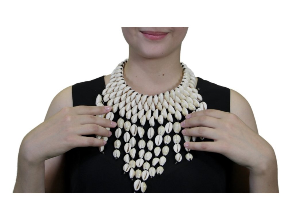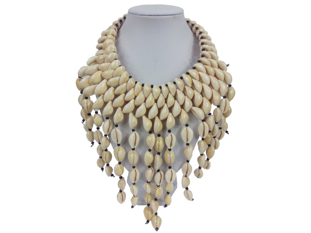 Tento výrazný náhrdelník z přírodních mušlí kauri upoutá svým jedinečným designem – několik řad mušlí se plynule rozvíjí do kaskádovitého spadu, který elegantně zdobí dekolt. Kombinace světlých mušlí a černých skleněných korálků vytváří působivý kontrast a přináší do každého outfitu dotek exotické noblesy.