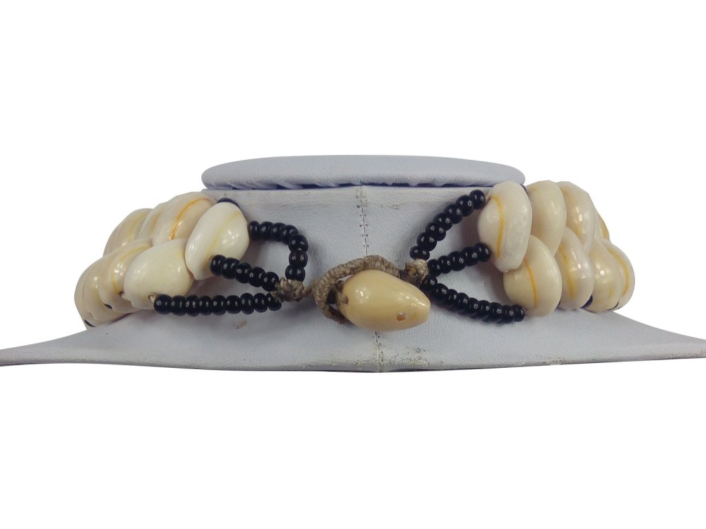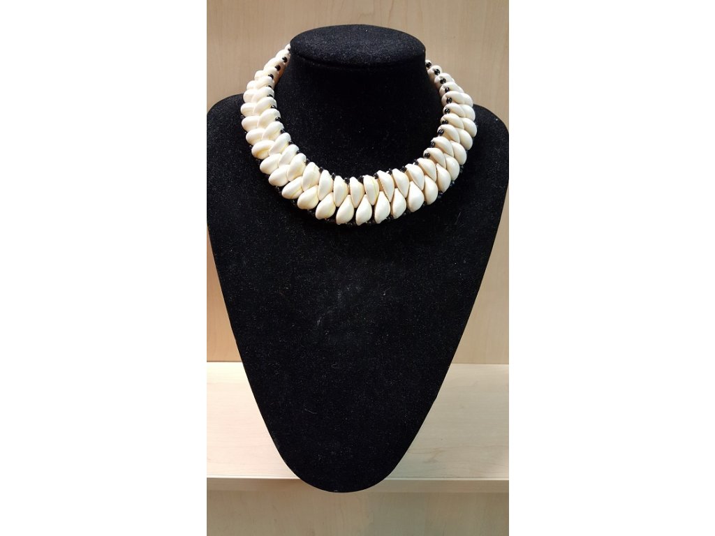 Tento boho náhrdelník z přírodních mušlí kauri kombinuje tradiční africkou estetiku s jemnou elegancí. Mušle jsou ze dvou řad navlečeny na páscích černých skleněných korálků, což vytváří přirozený most přes linii krku a dodává šperku sofistikovanou strukturu.