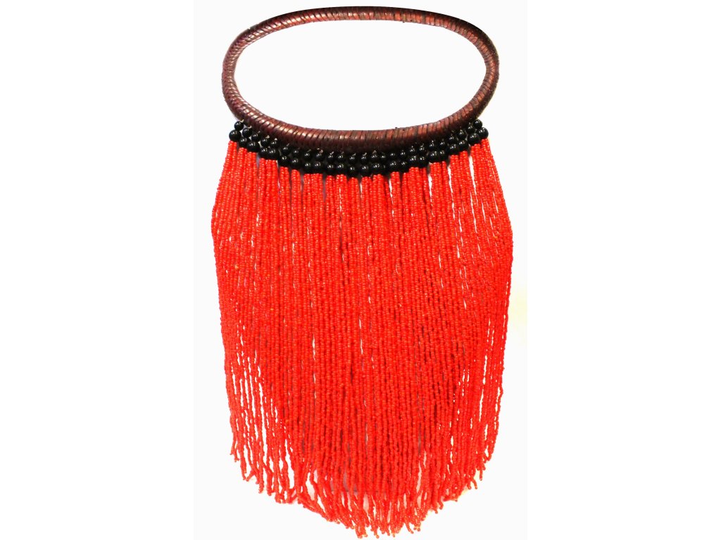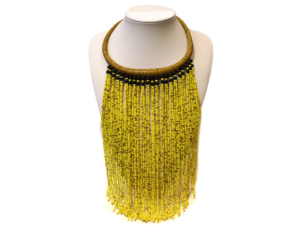 Základ tvoří pevný kožená masivní šňůrka, na kterou jsou pevně navlečeny dvě řady skleněných korálků. Z nich pak volně visí dlouhé šňůry drobných rokajlů, vytvářející jemný závoj, který se krásně přizpůsobí tvaru krku a dekoltu. Jednoduché zapínání na kožené očko zajišťuje pohodlné nošení.