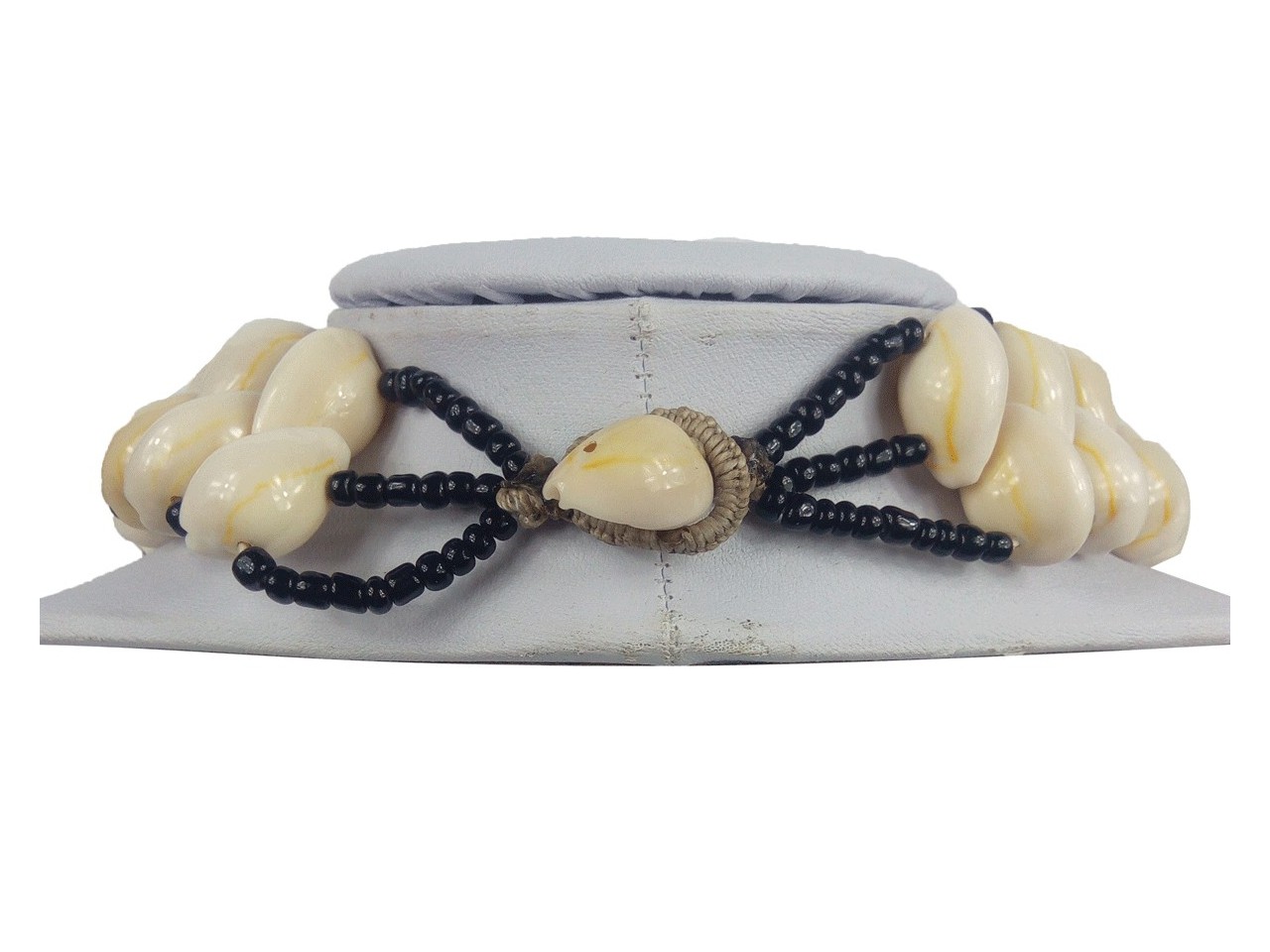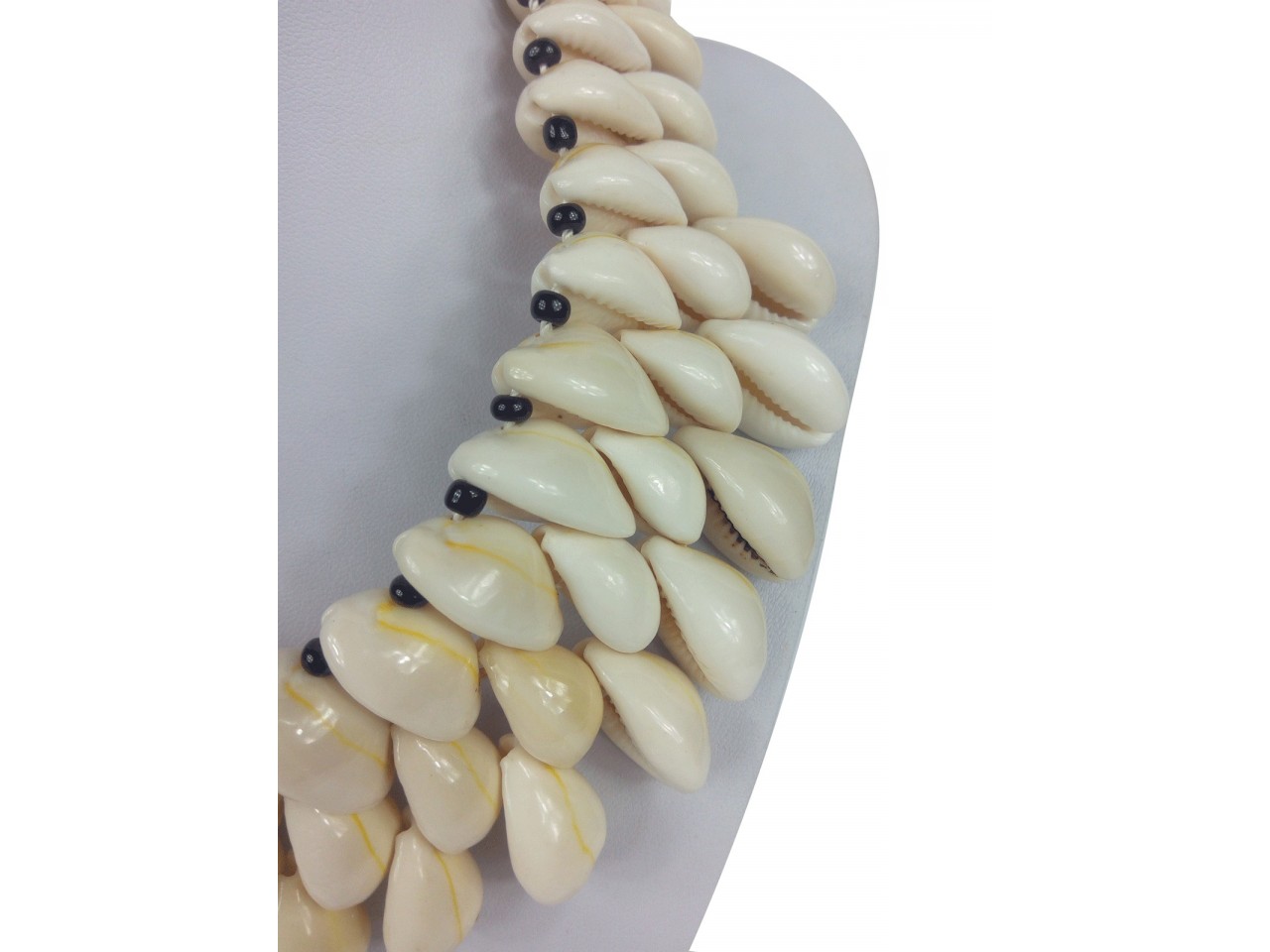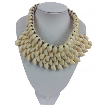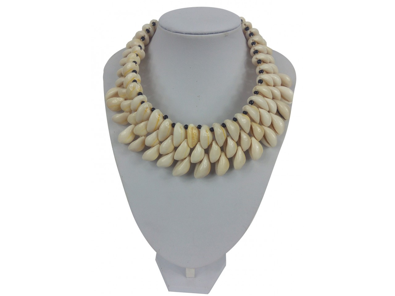 Šperk tvořený přímo plody moře sestává z 3 řad mušlí navlečených na páscích skleněných černých korálků. Náhrdelník byl s výjimečnou pečlivostí ručně vyroben v soukromé dílně v západní Africe. Právě proto je každý kus zcela originální a nepatrné odchylky v jednotlivých kusech dodávají každému produktu na autentičnosti.