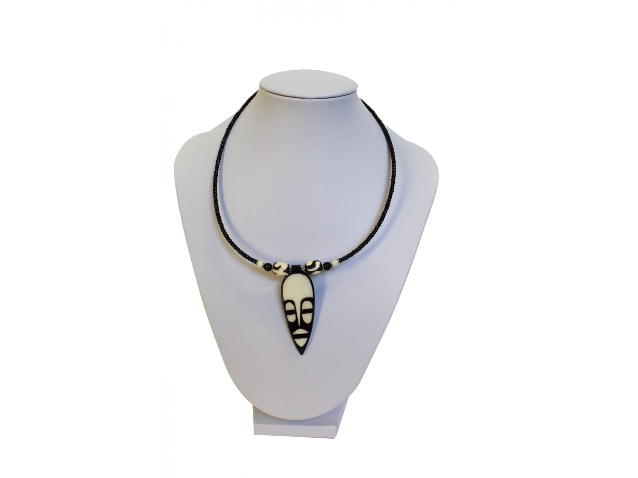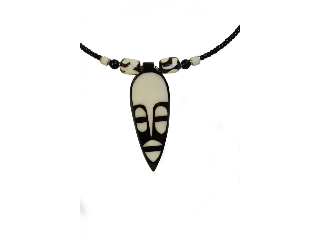 Ručně vyrobený etno náhrdelník s přívěskem ve tvaru masky z batikované kosti a barevných skleněných korálků, pečlivě navlečených na kovovém drátku. Autentický africký šperk, který sluší ženám i mužům.