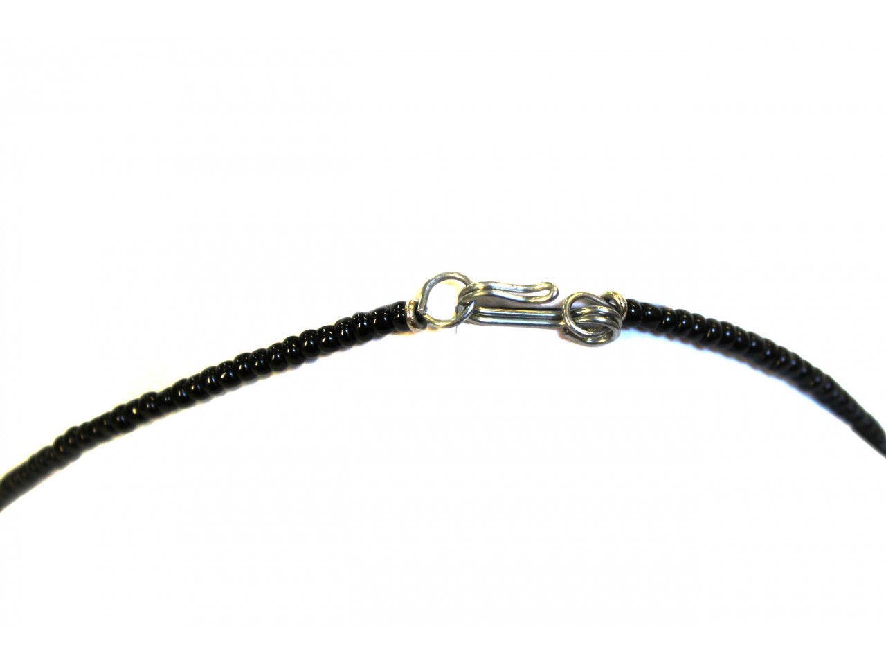 Kostěný přívěsek pochází z recyklovaných zdrojů – je pečlivě čištěný, řezaný, broušený a barvený tradičními technikami. Každý motiv je originál, stejně jako příběh řemeslníka, který jej vytvořil. Skleněné korálky, ručně navlékané v dílnách v Keni, dodávají náhrdelníku harmonický černobílý vzhled a jemnou eleganci.