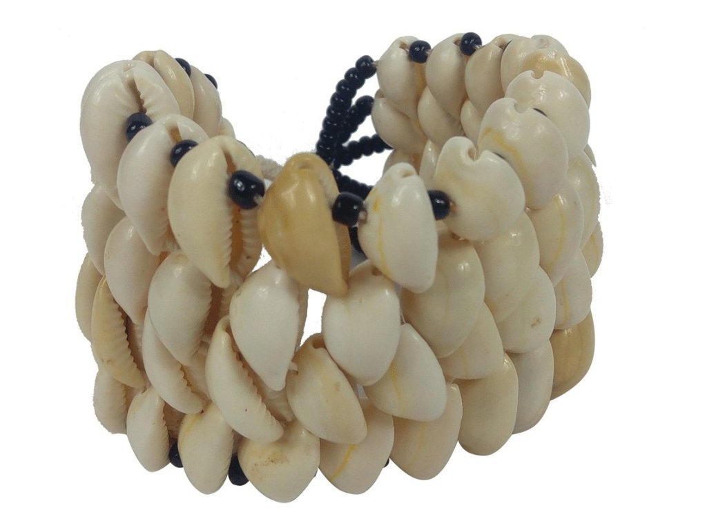 Čtyři řady mušlí jsou navlečeny na páscích černých skleněných korálků, které vytvářejí elegantní kontrast a dodávají šperku boho-etno charakter s přirozenou harmonií.