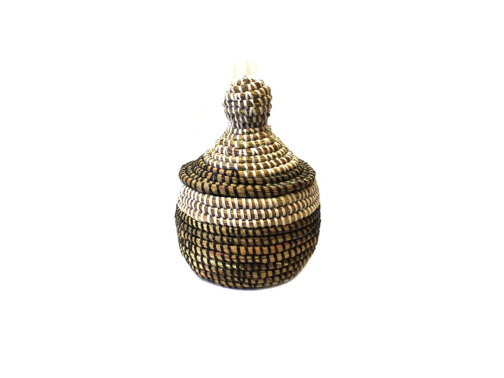 Tento autentický senegalský košík s víkem vzniká tradiční technikou ručního pletení, která se v senegalských komunitách předává z generace na generaci. Použité přírodní palmové listy jsou doplněné o recyklované plastové provázky, což zajišťuje pevnost a odolnost košíku a zároveň podporuje ekologické a udržitelné využití materiálů. Každý kus je jedinečný, drobné odchylky ve vzoru či barvě jsou důkazem skutečné ruční práce a autenticity.