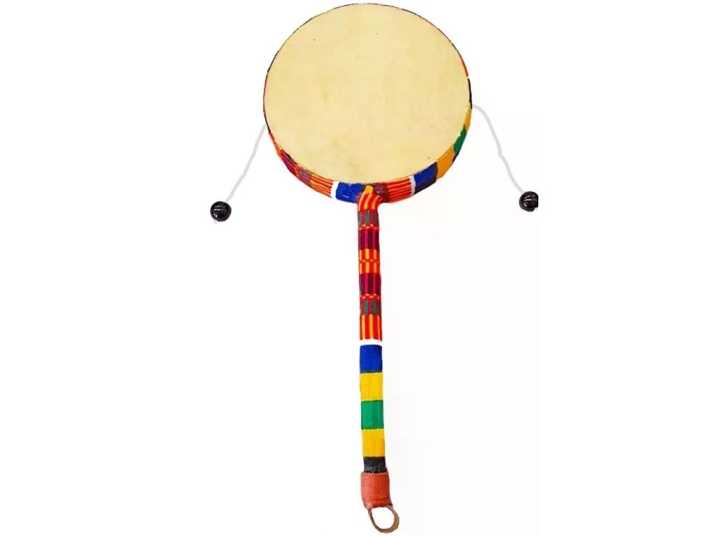 Dřevěná tyč sloužící jako držák je spolu s obvodem bubínku obalena tradiční africkou látkou Kente, která patří v Ghaně k symbolům kulturní identity a dědictví. Každý kus je originál a může se mírně lišit vzorem či barevným laděním.