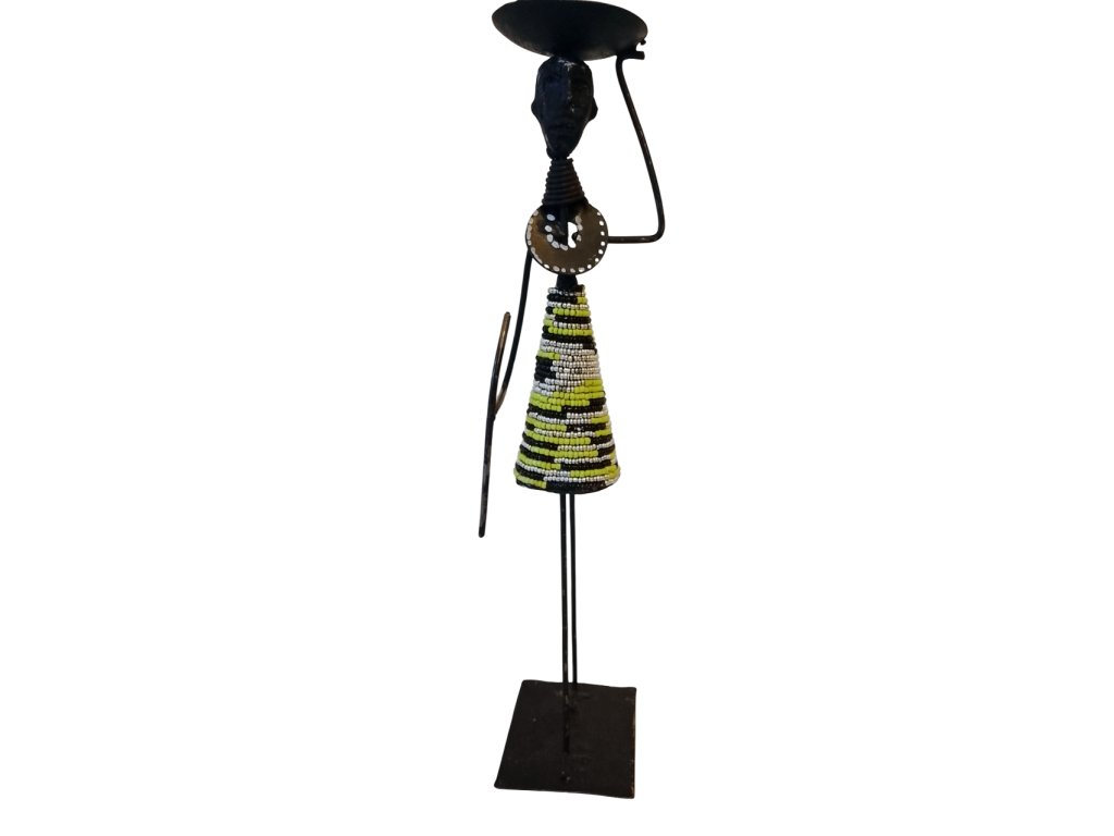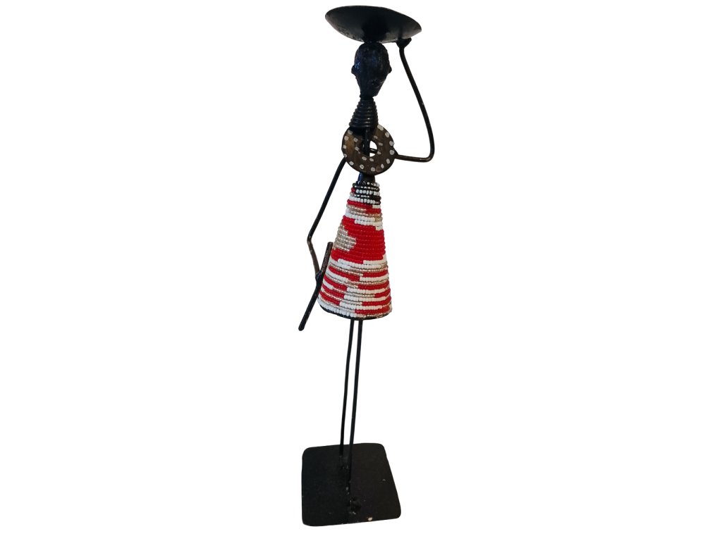 Dodejte svému domovu styl, teplo a originální atmosféru s tímto ručně vyráběným svícnem z Keni. Hlavní motiv tvoří masajská žena z recyklovaného kovu, která nese na hlavě kovovou misku se středovým trnem pro zapíchnutí svíčky. Její sukně z barevného rokajlu a typický masajský náhrdelník dodávají svícnu autentický africký šarm.