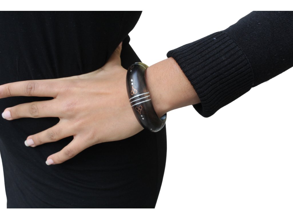 Každý náramek je ručně vyřezán ze vzácného ebenu s hlubokou černou až černohnědou barvou, doplněný jemnými kovovými rytinami, které dodávají šperku originální vzhled a symbolický význam. Materiál pochází ze zbytků dřeva, čímž šperk vzniká udržitelným způsobem, a přitom si zachovává autentickou krásu.